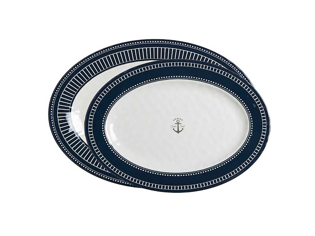 Servizio da tavola realizzato in melamina al 100%, BPA free. Sui toni del blu navy e bianco, il suo design martellato dà l’effetto della porcellana. Lavabili in lavastoviglie. Dimensioni cm 41 x 29 e cm 35 x 26