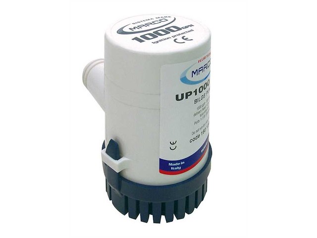 Pompa Marco UP1000. Portata 63 Lt/min. - Alimentazione 12 volt. - Prevalenza 4 mt. - Consumo 4 A - Fusibile consigliato da 10 A - Motore 50 Watt - Tubo uscita 30 mm. - Dimensioni Ø 81 mm. altezza 124,50 mm. - Portata: 63L./min. .