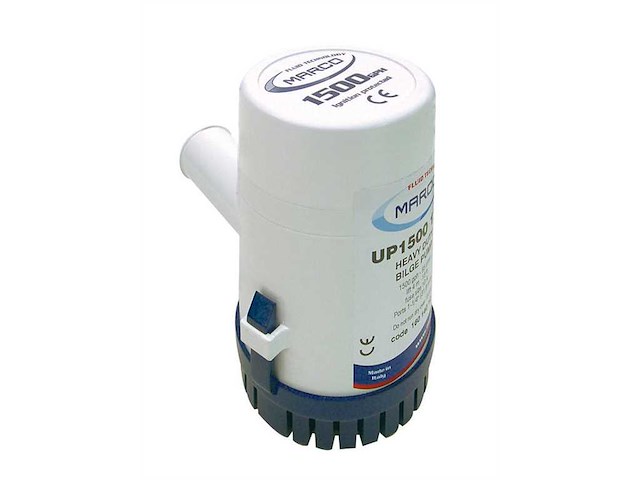 Pompa Marco UP1500. Portata 95 Lt/min. -Alimentazione 12 volt. - Prevalenza 4 mt. - Consumo 10 A - Fusibile consigliato da 20 A - Motore 120 Watt - Tubo uscita 30 mm. - Dimensioni Ø 100 mm. - Altezza 160 mm. . Portata: 95L./min. .