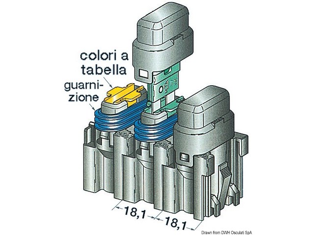 Componibili ad incasso. Guarnizione in silicone e secondary-Lock colorato per identificazione amperaggio, fusibili a lama standard.Usa fusibili a lama14.004.10/30/40/50/70. Un portafusibile completo viene composto da: 1*14.117.XX + 2*14.118.XX + 1*14.116.01.