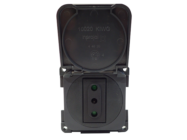 Presa Italiana230 V con coperchio e protezione posteriore.Foro di incasso Ø mm. 45,profondità mm. 48. Equipaggiamento elettrico modulare in plastica grigia ral 7015