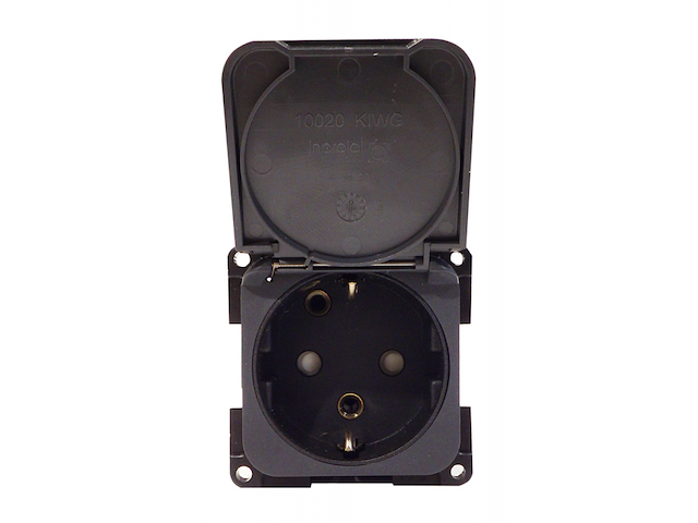 Presa Schuko230 V con coperchio e protezione posteriore.Foro di incasso Ø mm. 45, profonditàmm. 48. Equipaggiamento elettrico modulare in plastica grigia ral 7015