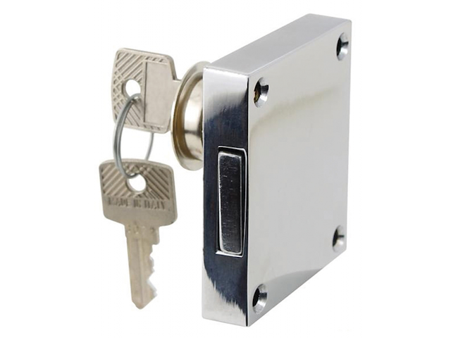 Serrature in ottone cromato da appoggio a due mandate, misura mm. 60x53,cilindro Ø mm. 20, sporgenza cilindro mm. 22, quadro mm.8