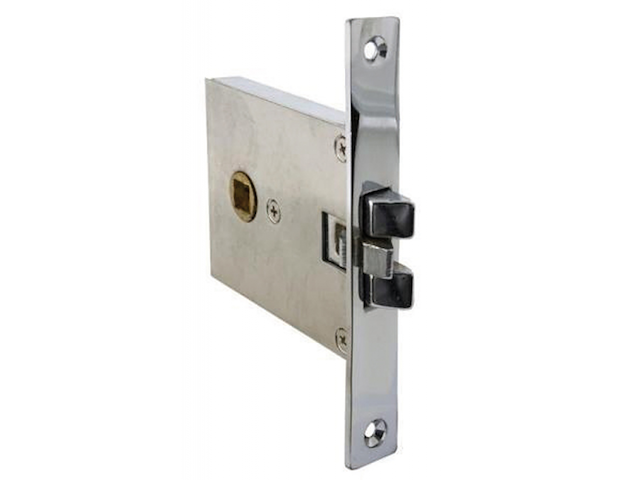 Serratura da incasso in ottone cromato a scrocco antivibrante. Incasso mm. 70x60x10. Mostrina mm. 110x16x2. Quadro mm. 8.