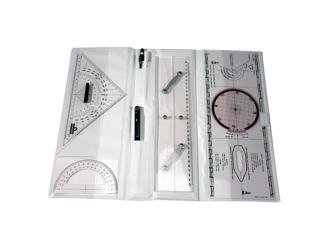 Set carteggio raccolto in una pratica custodia in plastica elettrosaldata composto da: parallela a snodo, squadra nautica, goniometro, tracciatore di rotta, compasso, matita e gomma.
