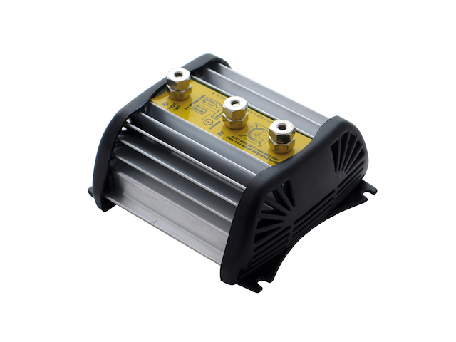 Isolatore ripartitore automatico di batteria a bassissima caduta di tensione (0,25V). Consente di ricaricare due batterie simultaneamente 70 AMP a uscita, fornendo più carica alla batteria più scarica. Realizzato in alluminio con ampia alettatura atta a dissipare efficacemente il calore. Dim. 130x130x70 mm.