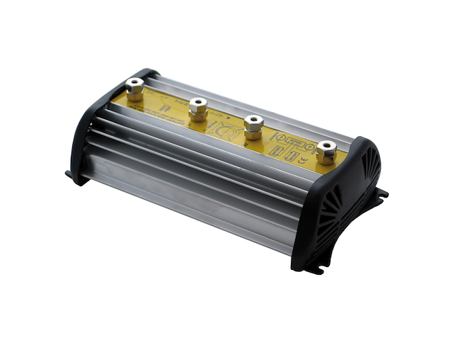 Isolatore ripartitore automatico di batteria a bassissima caduta di tensione (0,25V). Consente di ricaricare quattro batterie 70AMP simultaneamente, fornendo più carica alla batteria più scarica. Realizzato in alluminio con ampia alettatura atta a dissipare efficacemente il calore. Due ingressi per alternatore. Dim. 230x130x70 mm.