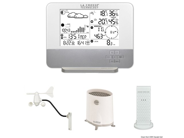 Completa di sensori esterni temperatura, umidità, anemometro, pluviometro radiocontrollati senza fili. La stazione si può connettere al PC via USB (Windows 7 32 bit) e riceve i dati dai sensori fino a 30 m di distanza (433 mH2).Informazioni fornite:1) ora radio controllata + calendario, + allarmi settabili;2) temperatura esterna/interna Celsius e Fahrenheit con segnalazione min/max e trend + temperat