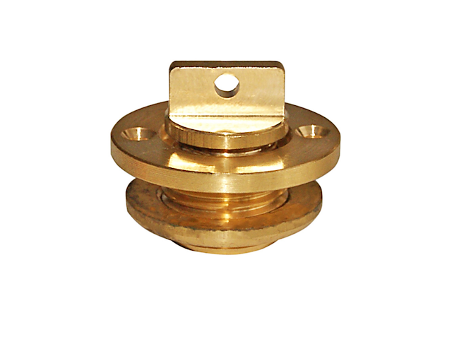 Tappo scarico acqua in ottone con flangia di bloccaggio per spessori da mm. 10, Ø int. mm. 15, flangia Ø mm. 37