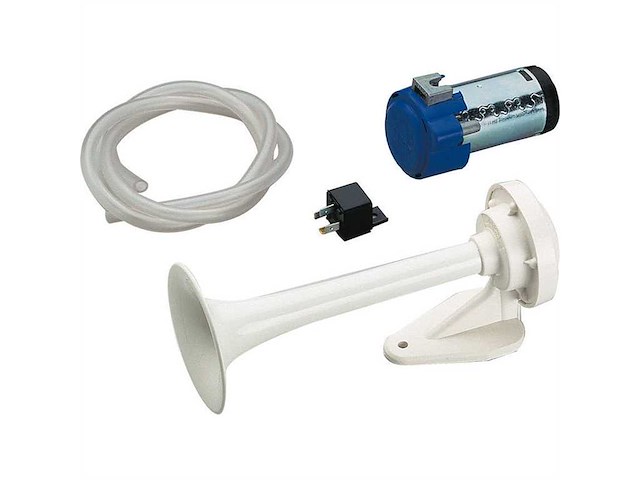 Tromba elettropneumatica con corpo in ottone verniciato bianco. Cornetto in tecnopolimero verniciato bianco. Completa di compressore ed accessori. Lunghezza 250 mm. . Alimentazione 12 volt.