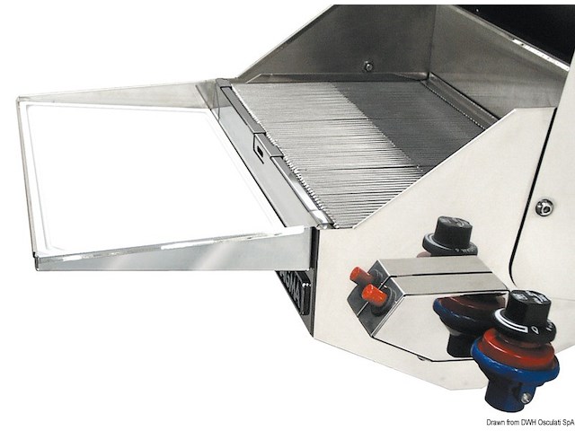 Fabbricato in acciaio inox con piano in polietilene HD. Si aggancia al barbeque e serve sia come piano di lavoro che come vassoio di portata se sganciato.