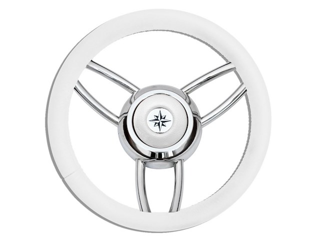 Volante a 6 razze Ø mm.16 curve in acciaio inox lucidato a specchio. Mozzo in acciaio con coperchio in vera pelle con logo rosa dei venti al centro. Impugnatura in poliuretano morbido. Inclinazione 7°. Cono universale