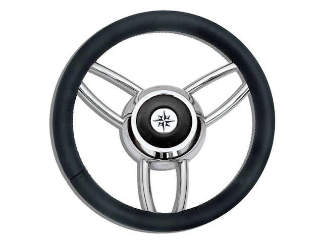Volante a 6 razze Ø mm.16 curve in acciaio inox lucidato a specchio. Mozzo in acciaio con coperchio in vera pelle con logo rosa dei venti al centro. Impugnatura in poliuretano morbido. Inclinazione 7°. Cono universale