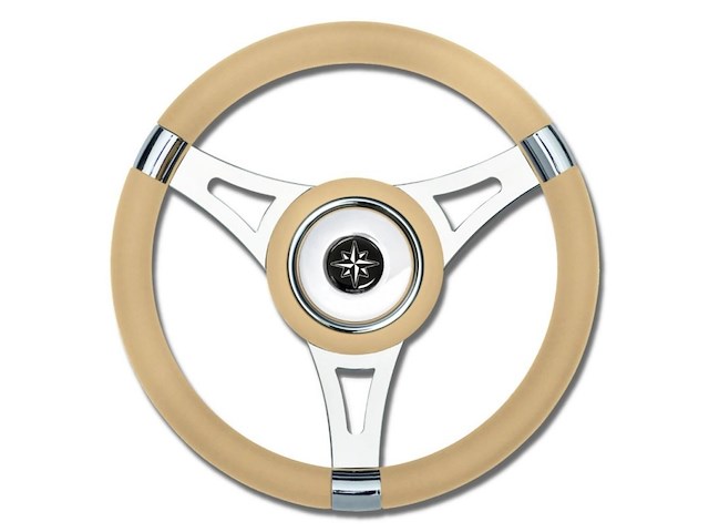 Volante a 3 razze in acciaio inox lucidato a specchio. Mozzo in acciaio, coperchio in vera pelle con logo rosa dei venti al centro. Impugnatura in poliuretano morbido. Inclinazione 7°.
