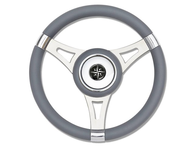 Volante a 3 razze in acciaio inox lucidato a specchio. Mozzo in acciaio, coperchio in vera pelle con logo rosa dei venti al centro. Impugnatura in poliuretano morbido. Inclinazione 7°.