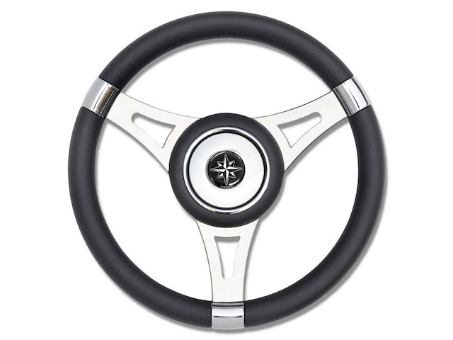 Volante a 3 razze in acciaio inox lucidato a specchio. Mozzo in acciaio, coperchio in vera pelle con logo rosa dei venti al centro. Impugnatura in poliuretano morbido. Inclinazione 7°.